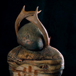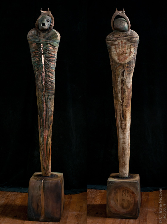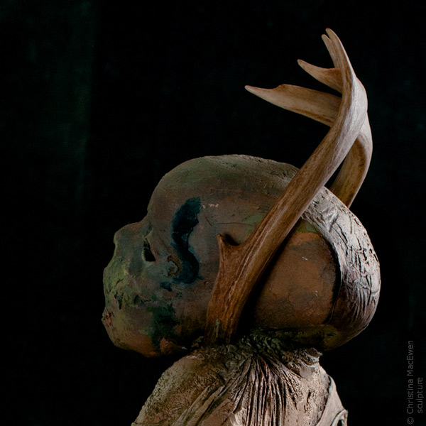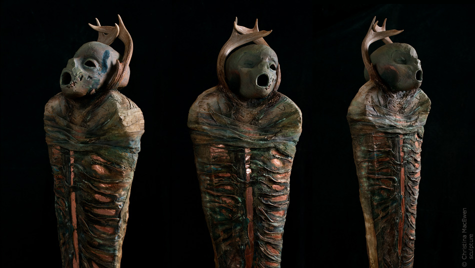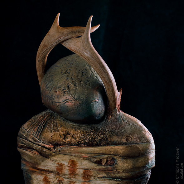 stoneware clay, linen, copper, antler, pigmentsht. 5'